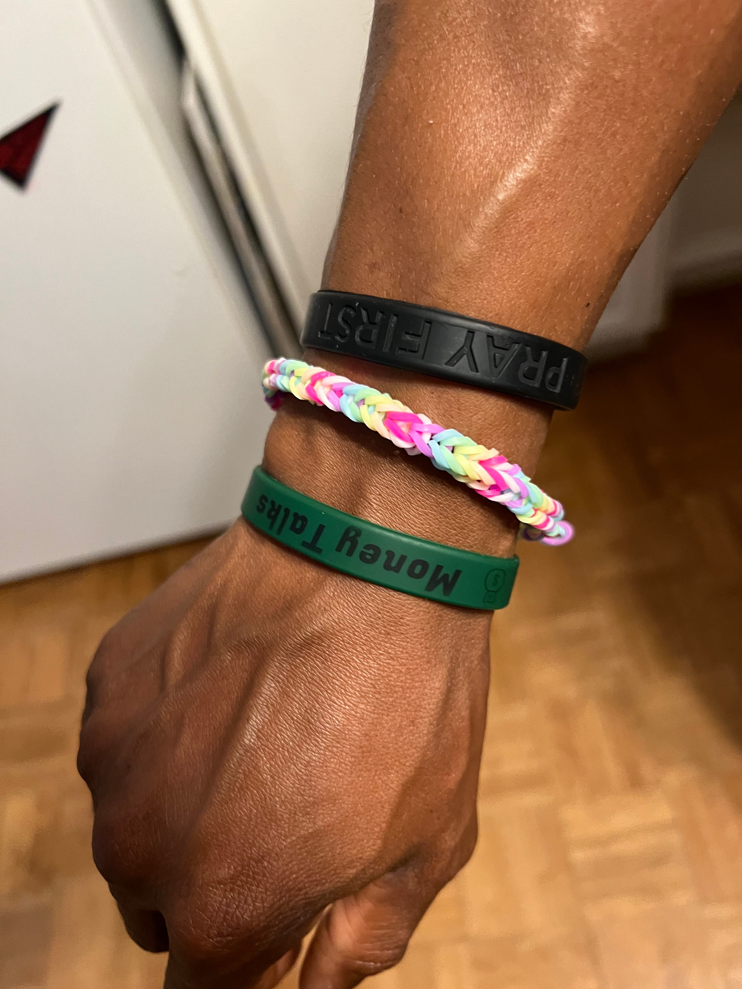 Long before entering, Parker left an envelope outside my bedroom door. Inside was a multicolored, rubber bracelet she made as my gift. I promptly slid it on my right wrist, along with my green Money Talks bracelet and black “Pray First” bracelet.