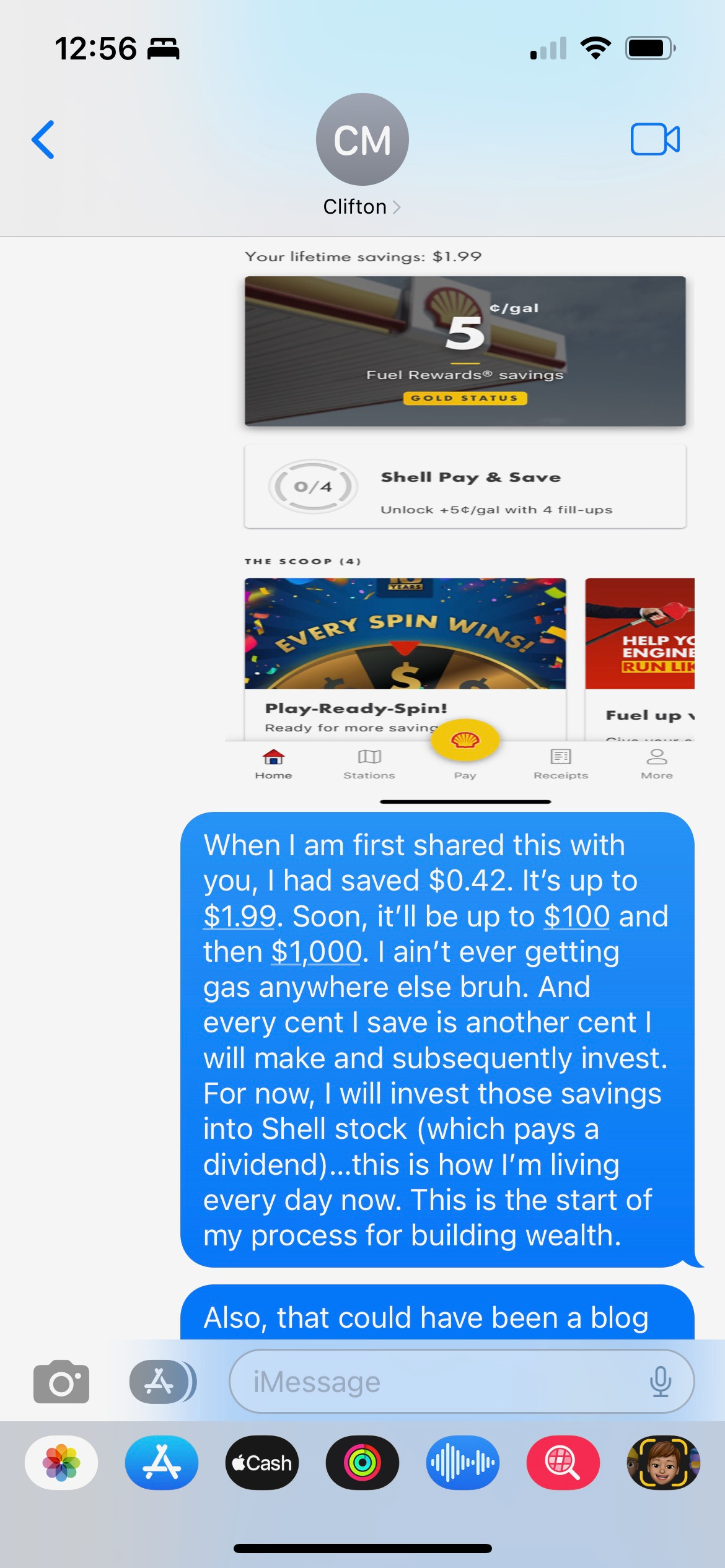 I shared my commitment to Shell with my brother Clifton in a text message on Oct. 28, telling him “most of what I do with my money these days MUST be something where my money is working for me.” Two weeks later, I texted him again when my gas savings had reached $1.99 but my sights already were set on $100 and $1,000.