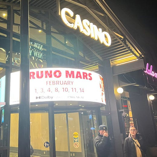 I’d made it so close to Bruno Mars (literally standing and ogling at the actual attendees from outside the theater’s entrance on the casino floor) yet never felt so far away. I’d seen Bruno Mars perform before, long ago in Oklahoma City. It cost much less than $650 back then. Even his Friday night performance in Vegas was selling for $100 cheaper per seat than the Saturday show I sought. But it’s because I’ve seen Bruno Mars in concert that I knew he’d be worth every penny.