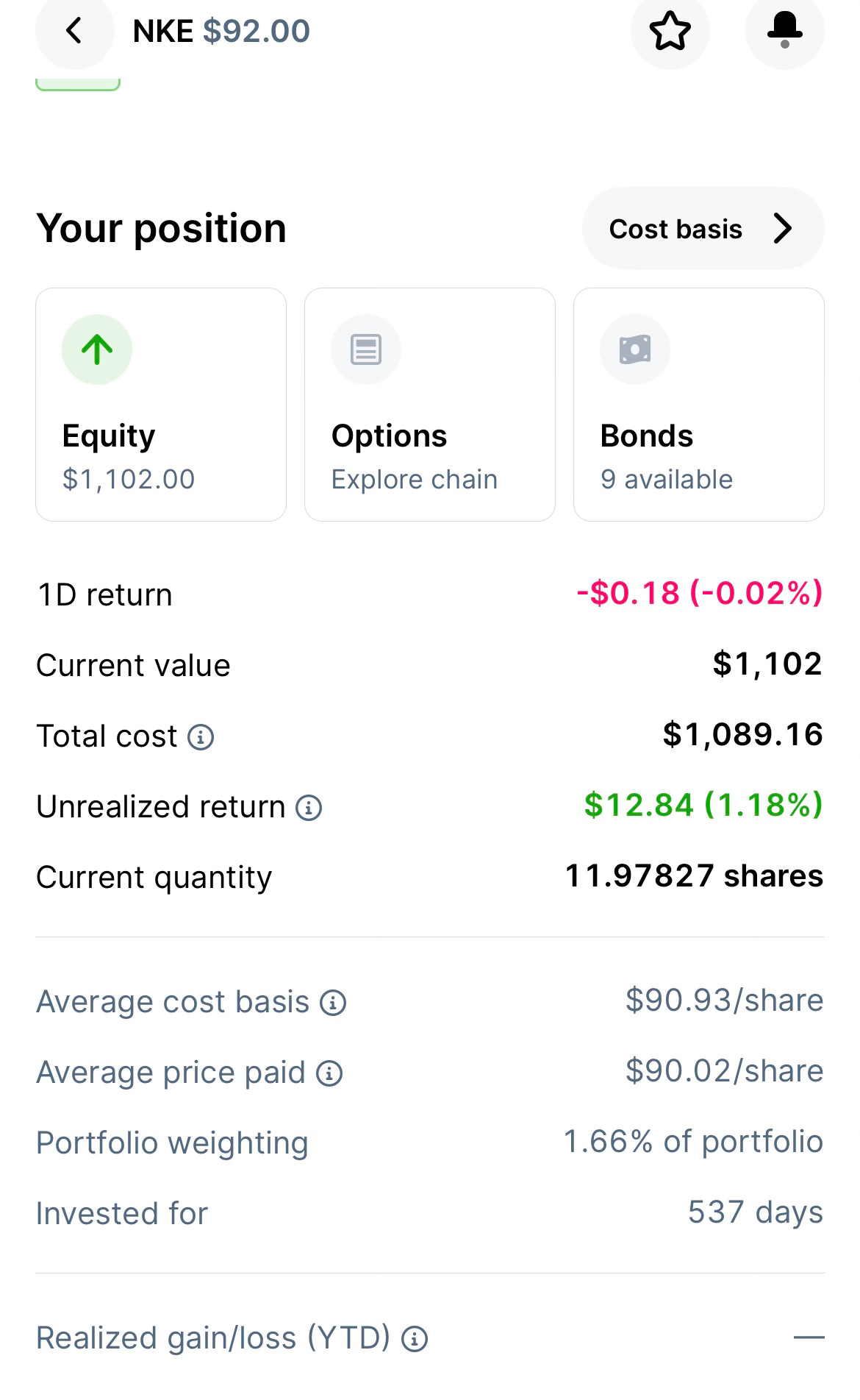 I bought one more share of Nike stock for $88.80, which bumped my stake to almost 12 shares.
