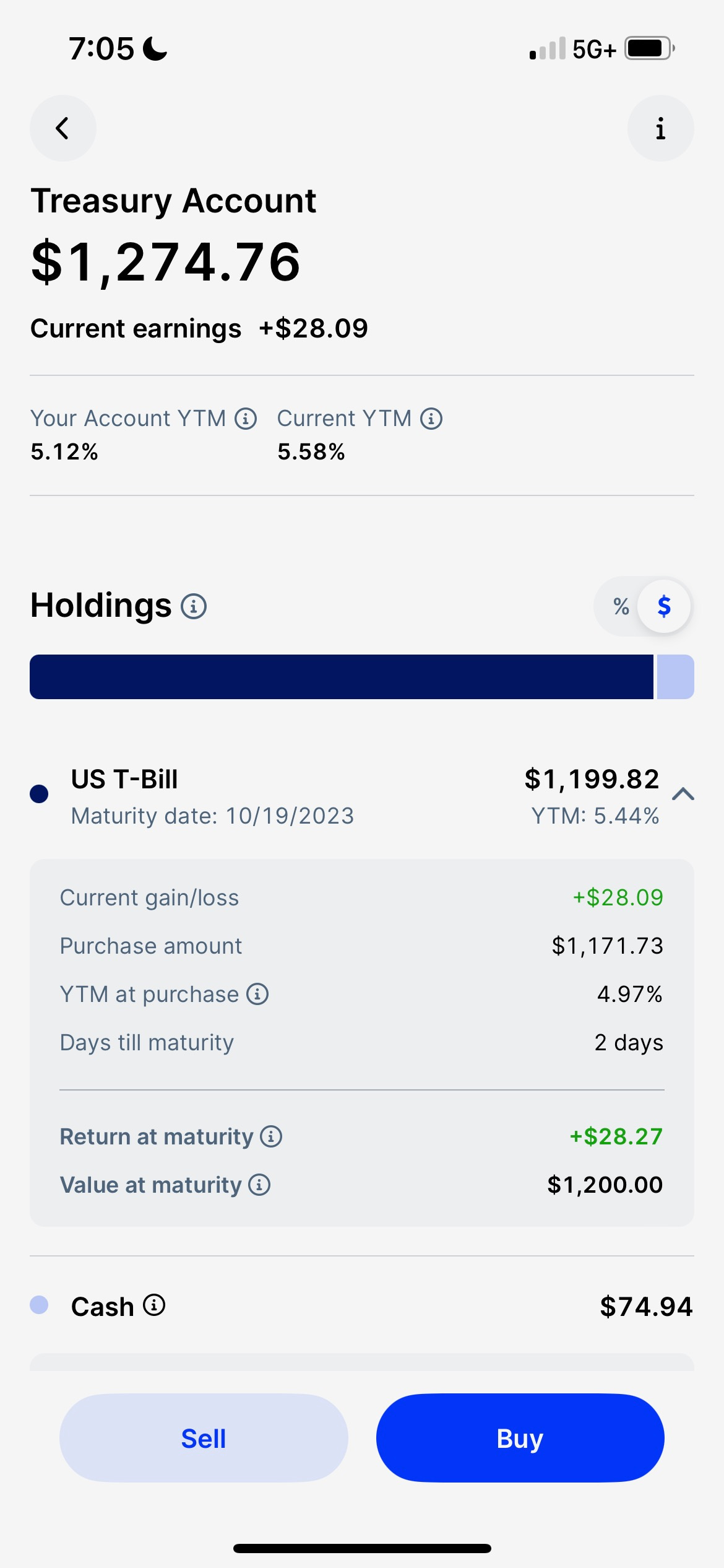 I funneled $1,250 into my brokerage’s treasury account. I’m still trying to figure out why only $1,171.73 was used to secure my T-bill. That means I’ve had $74.94 sitting idly, which doesn’t feel good.