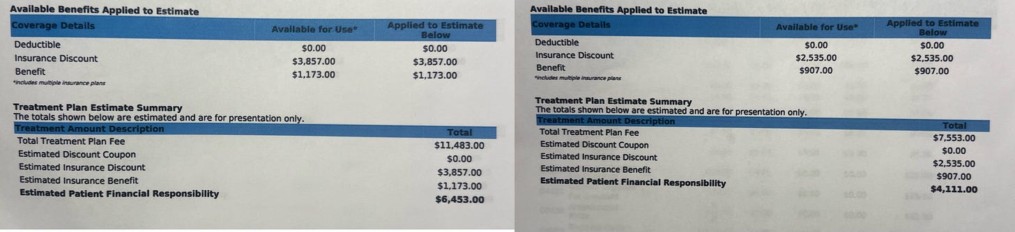 For example, I must pay out of pocket for each crown. At $1,727 each, they jump out as the most expensive line item.