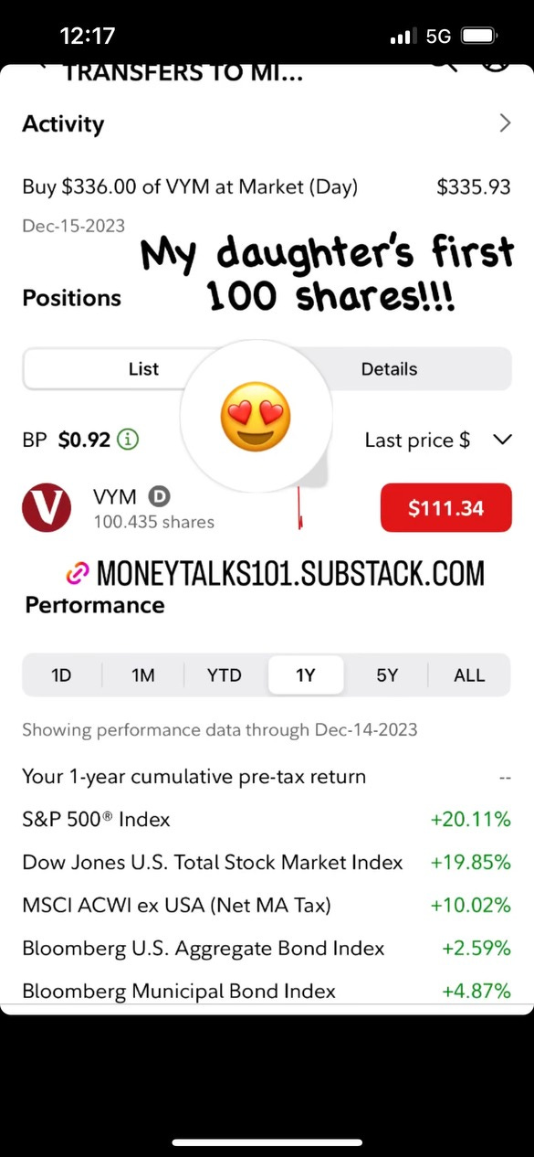 When I made my monthly contribution to Parker’s brokerage account in mid-December, the deposit and subsequent investment pushed her past 100 shares of the VYM.
