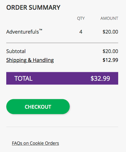 To get my cookies shipped, I needed to order a minimum of four boxes. Just like that, five bucks shot up to $20. At first, it was no big deal. I used it as an opportunity to diversify. I added a second box of Tagalongs, jumped on a box of Do-si-dos and, for Parker, threw in a box of Adventurefuls. My mouth began watering in anticipation. The site claims cookies arrive in as few as two business days.