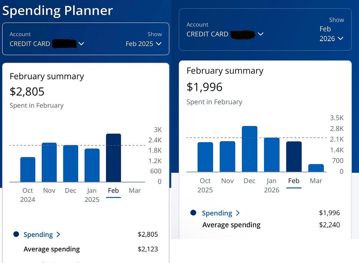 My February spending tells the story. Compared with February 2025, I spent $809 less this year. And when I looked closer at my credit card statement, more than half of my spending went to groceries and my tithe.