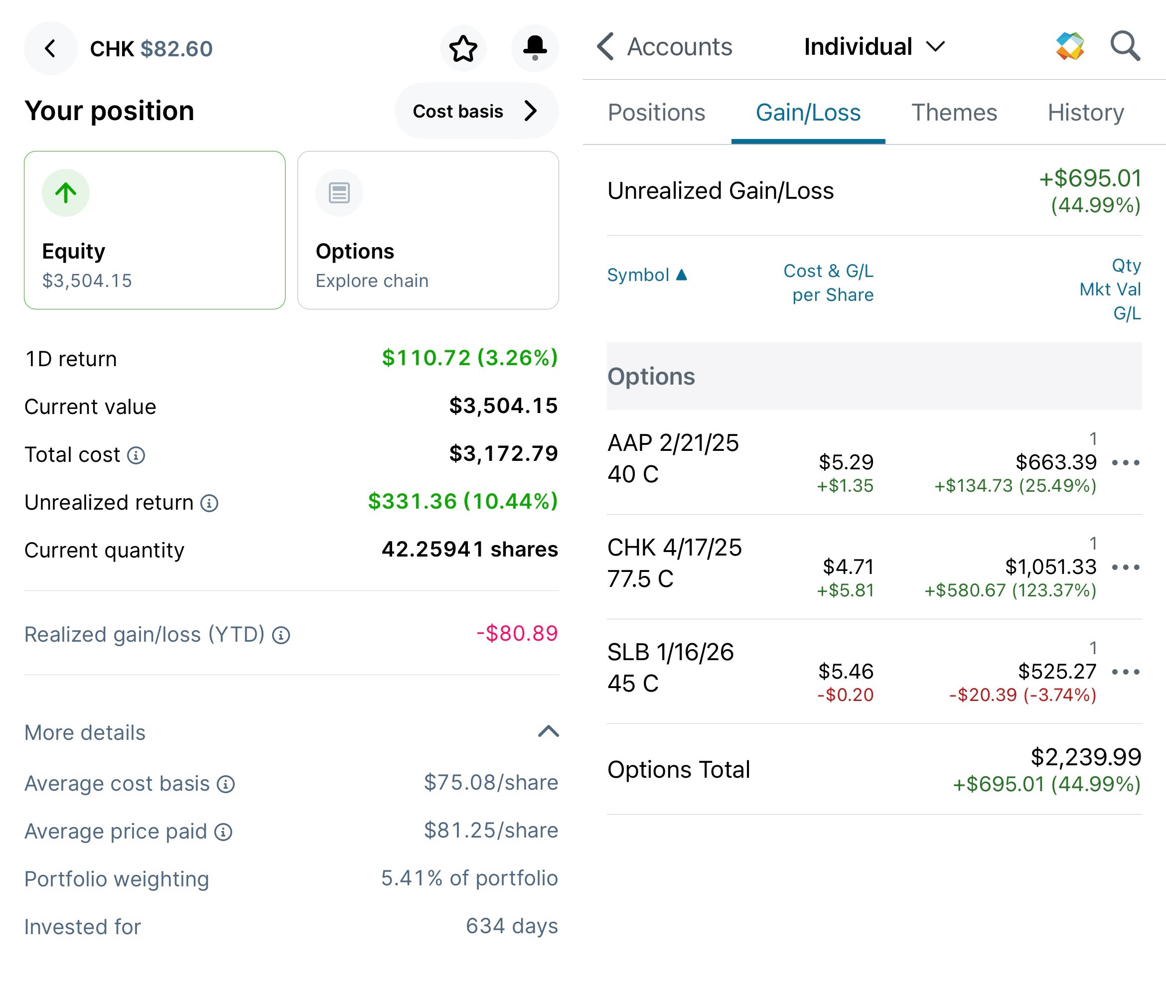I own 42.25941 shares of Chesapeake common stock. My total cost is $3,172.79. I’m currently up 10.44%, or $331.36. My stake has fluctuated, but I’ve held a position in the company for 636 days.