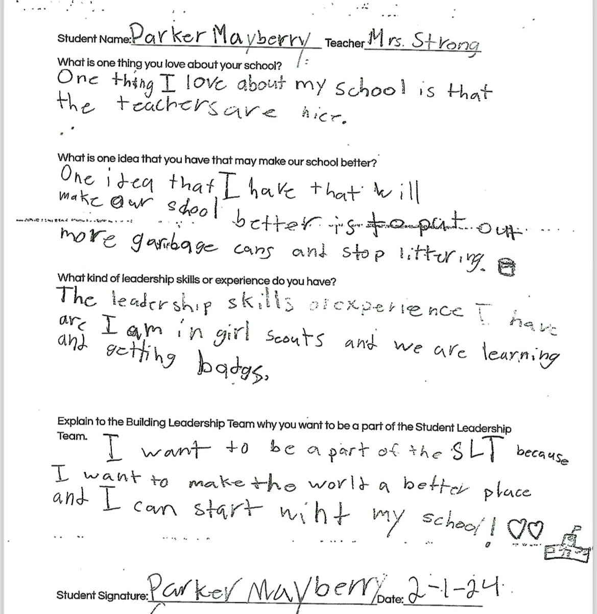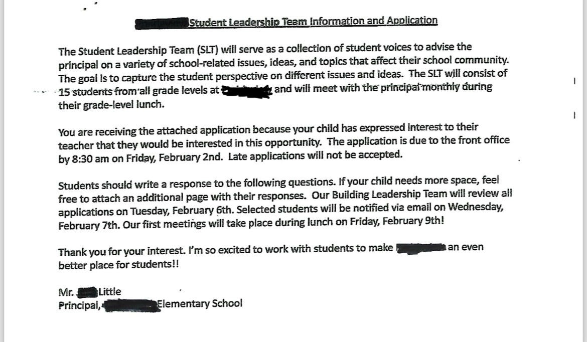 “The Student Leadership Team (SLT) will serve as a collection of student voices to advise the principal on a variety of school-related issues and topics that affect their school community,” the letter read. “The goal is to capture the student perspective on different issues and ideas. The SLT will consist of 15 students from all grade levels … and will meet with the principal monthly during their grade-level lunch.”